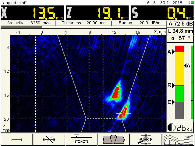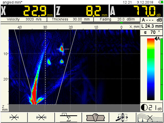 The instrument has ultra-compact design and is performed in lite-weight shockproof plastic housing. 800-gram weight allows one hand operation in hardly accessible locations. The Multi-SAFT image reconstruction technology offers unique flaw detection capability and extraordinary spatial resolution. Additional imaging and analysis functionality is provided by included INTROVIEW visualization software.